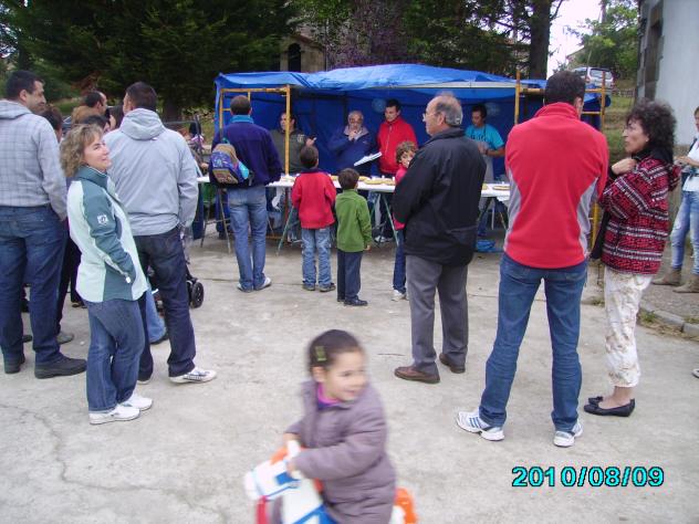 pueblo. en primer termino una de las concursantes de tortillas que sin huevo autoptono ni patata de la zona, consiguio llevarse el tercer