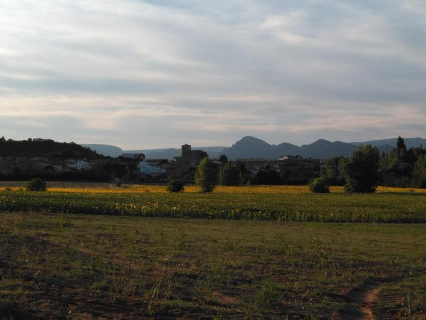 Girasoles al atardecer frente al caserío urbano,