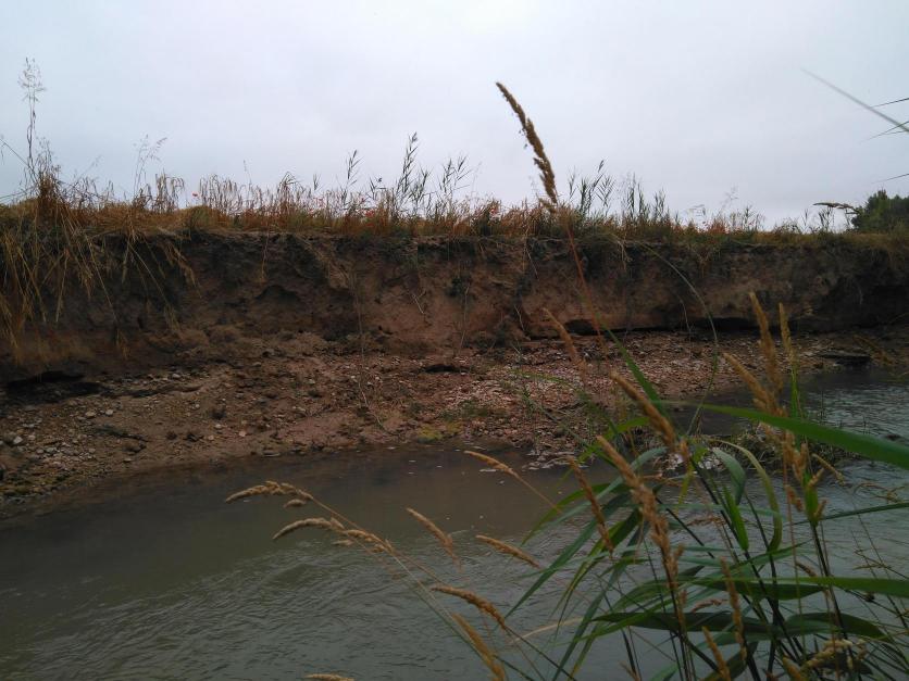 Más de los mismo: la erosión del río hace que el agua penetre en la grava de la base del talud; ésta se mueve; la tierra fértil de las capas superiores, cae por efecto de la gravedad.