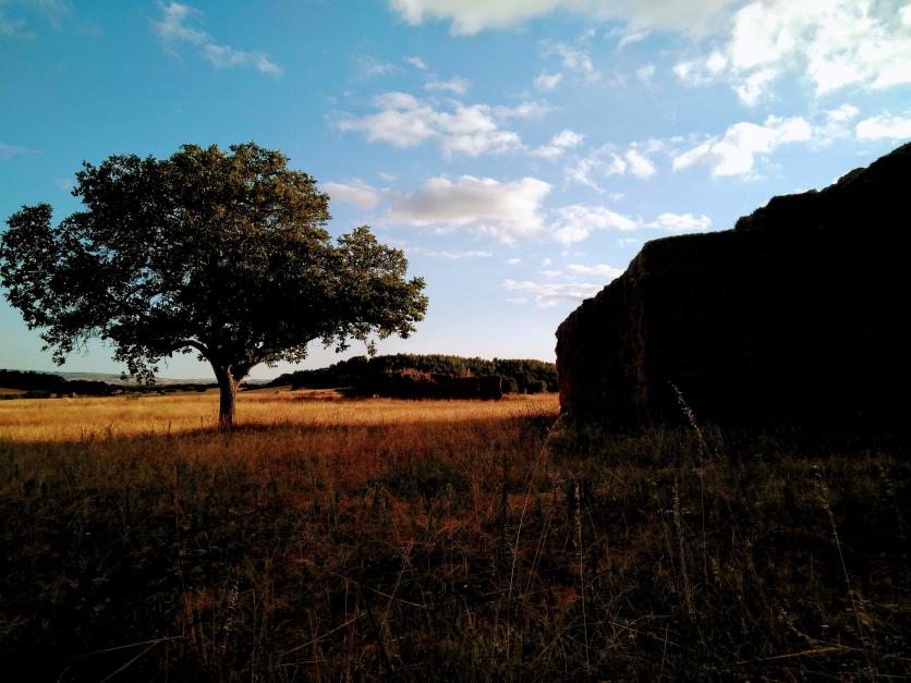 Atardecer entre nogales y fardos de paja en Las Tapias,