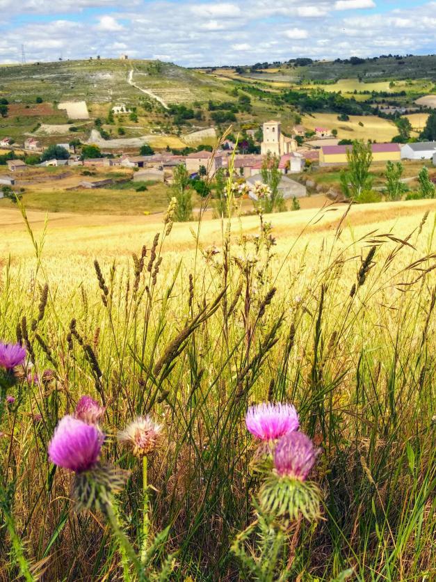 El cereal amarillo, el cardo rosa en plena floración, el