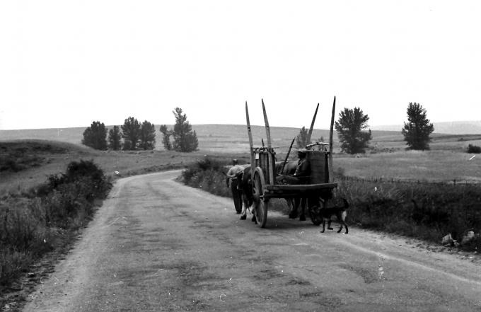 A recoger las "morenas" de trigo el la tierra, para luego trillar la espigas o recoger la hierba en los prados para el ganado. (1977). Delante Jesús, los bueyes Garboso y Montañés, Máximo (Moreno) en el carro y Curro detrás.