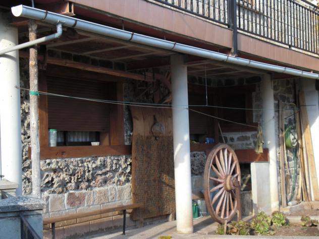 Casa con adornos de aperos de labranza antiguos,