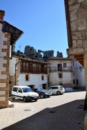 Centro del pueblo y al fondo imponentes formaciones rocosas que rodean al pueblo,