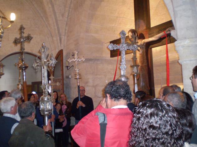 orando ante el Cristo con las cruces,