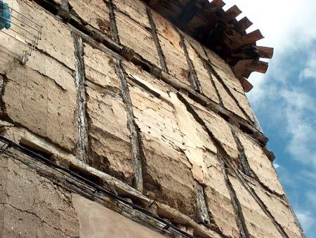 El entramado de madera y yeso tan tipicamente utilizado en las reconstruciones de las casas, en esta