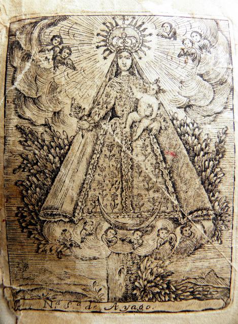 Esto es un grabado del Novenario anterior a 1815 y, por tanto, anterior a las tres ediciones que conocemos de la Novena a Ntra. Sra. de Ayago, en el se recoge una imagen de la Virgen de Ayago muy primitiva en su trazo y su estilo.