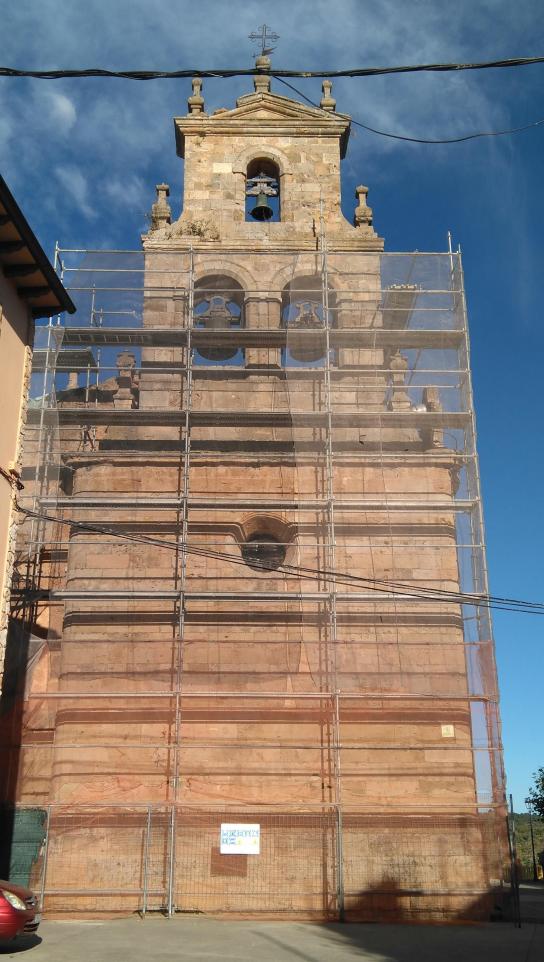 Pared exterior de la iglesia con su andamio por obras,