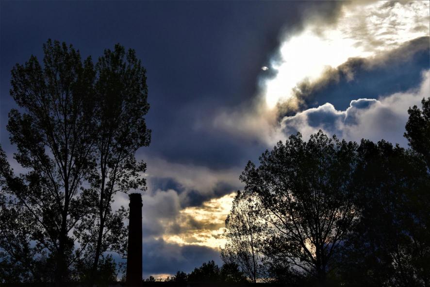 La chimenea de la antigua IPEM en un amanecer "fantasmagórico",