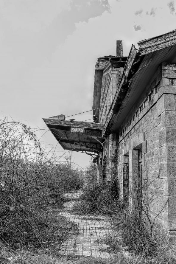 El andén de la estación lleno de maleza,