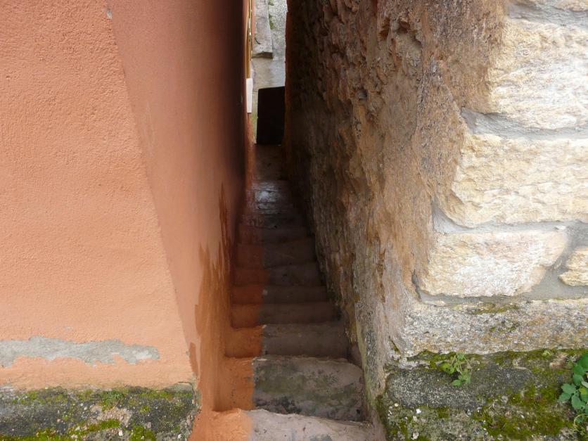 Un estrecho callejón con escalera,