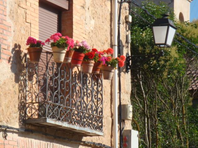Balcón florido con farola,