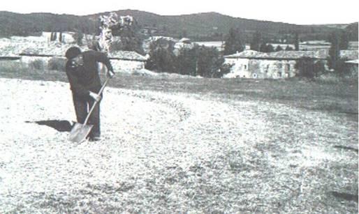 Dos parejas de bueyes arrastrando el trillo y dando vueltas en sentidos opuestos durante horas...transformaban los/las nías en paja y grano..a la mitad del proceso...se volteaba la parva... Como se observa en la foto. (PMB).