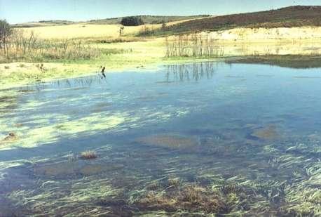 de Ropinos con abundantes algas acuáticas...Desde esta represa, a través de tuberías de aluminio, e impulsada por dos poderosas bombas, llega el