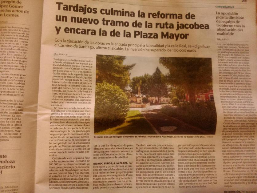 En esta legislatura no se había actuado sino para poner dos carteles en que pone:... Nada, que haré traslado de la noticia comentada en facebook, en honor a los que me despreciaron bloqueando a una amiga y vecina veraz. Es que me fui a Burgos el viernes, y cogí el periódico, casi por imán. Así que estaba el alcalde el día anterior procesionando por el pueblo tan empavonado. Con tanto como cuenta sin ton ni son.