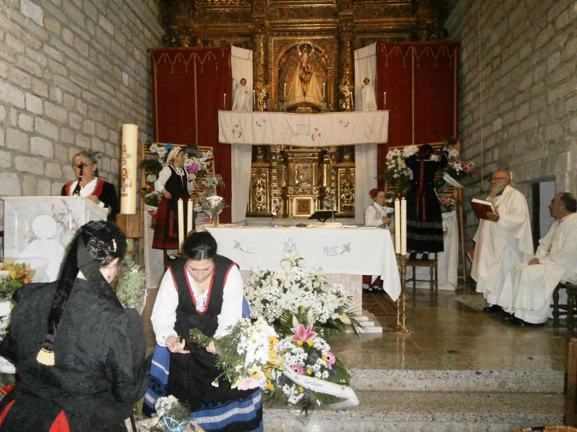 Las componentes del grupo de danzas colocando las flores en el altar mayor,