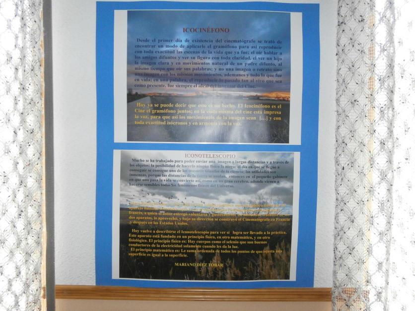 Los inventos del icocinéfono y el iconolescopio de Mariano Díez enmarcados en fotos de su pueblo,
