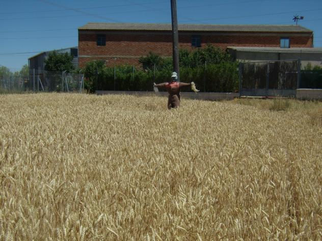 Este muñeco lo vi ayer y me llamó mucho la atención. Es un encantapájaros en vez de espantapájaros, al menos para mi. Es que los pájaros se tienen que reír mucho viéndole. A mi me causó mucha risa su vista y algo tan típico en un sembrado como el remolque del tractor amarillo que está muy cerca de ahí.