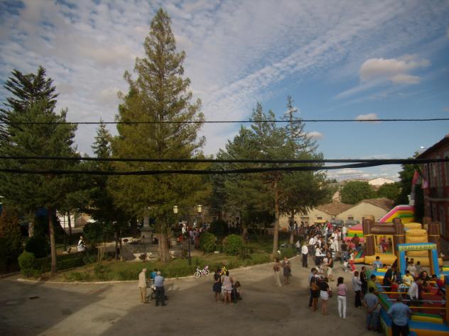 El día central de la fiesta, el día de la Asunción, la plaza presentaba este aspecto y el cielo también lucía unas nubes blancas así de peculiares. Tendría que quitar los cables de Iberdrola que estropean la vista pero entonces ocultaríamos parte de la realidad. Y los cables lucían así también a esas horas de la tarde en medio del bullicio.