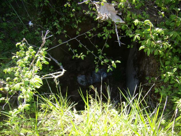 Pongamos que vamos por la carretera y nos tenemos que orillar, justamente ahí, ¡plash!, has caído en el vacío. Hoy, porque está para llover pero... Y este es el agujero o pozo, que no es demasiado grande pero si lo sufiente como para meterse en él y romperse una pierna como mínimo. Aquí es donde me contaron que se accidentó una peregrina, que no se que le pasaría, pero es algo que se puede evitar si se tapa o se hace una señalización adecuada. La vegetación lo tapa y por eso pasa desapercibido.