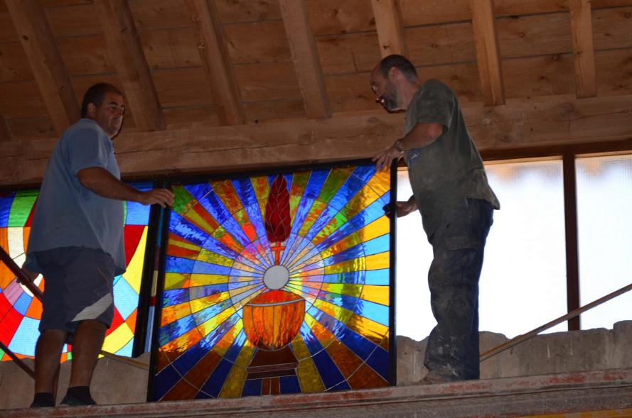Colocación de las vidrieras con temas religisos en la venta de coro de la iglesia,