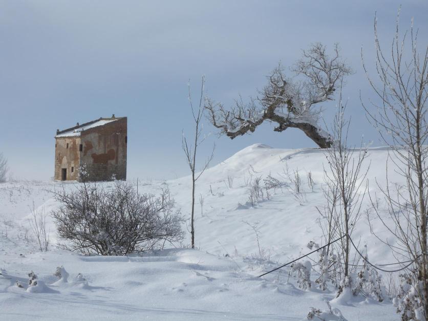 Viejo nogal y Palomar sobre manto banco,