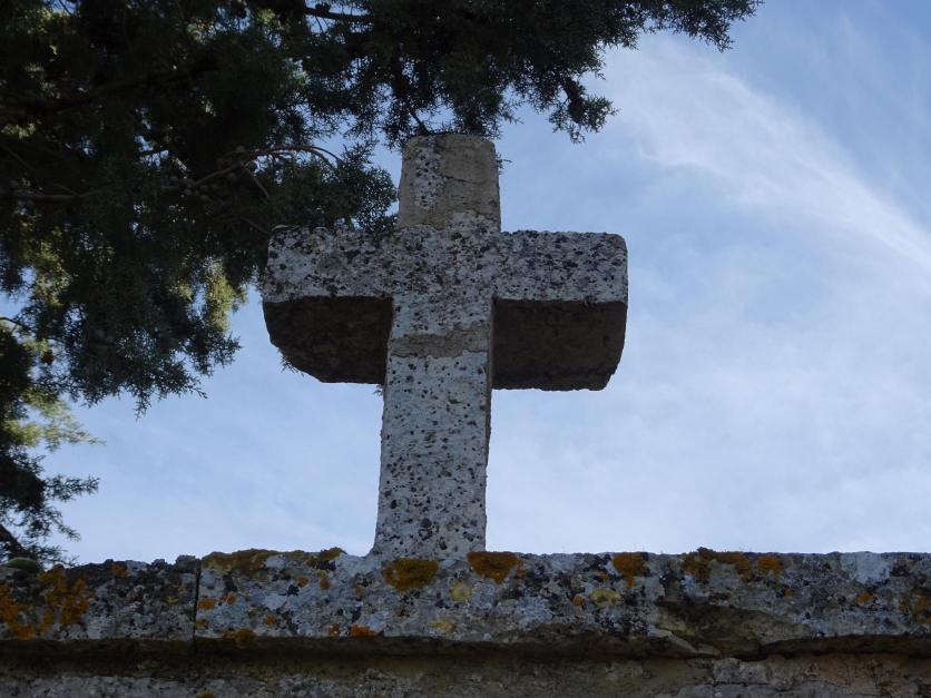 Cruz de piedra ubicada encima de la puerta del cementerio,