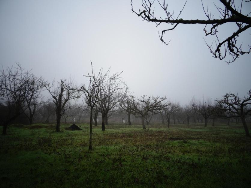 La niebla cubre los frutales,