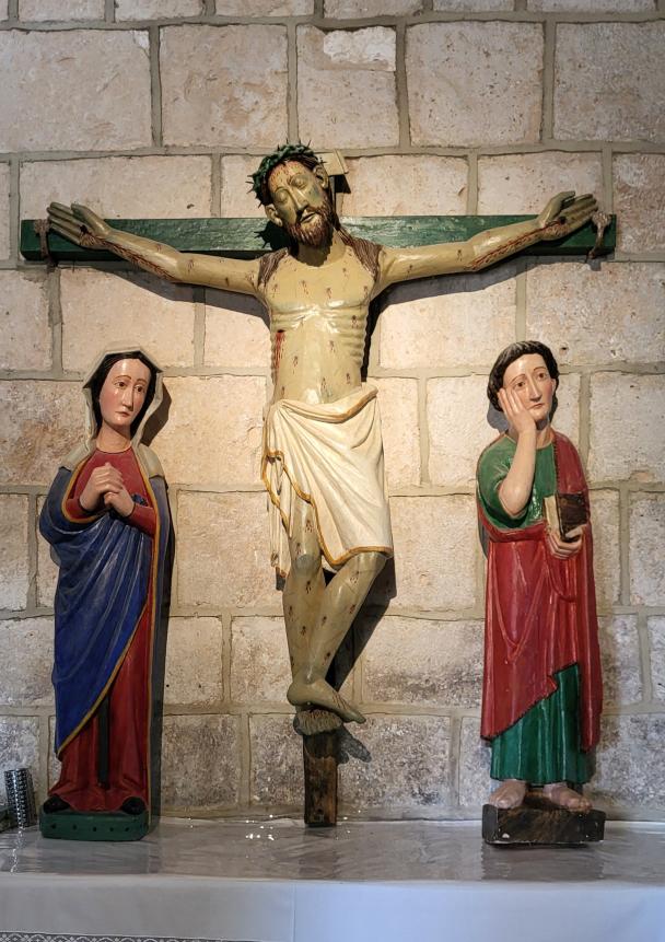 Este conjunto de figuras: Jesús crucificado y María-su madre- con San Juán al píe de la cruz, se conoce en el pueblo como el "Santo Cristo de las eras". Ha estado siempre en la ermita. Cuando el tejado de la sacristía se cayo, se trasladó el conjunto de las tres figuras a la iglesia del pueblo ocupando el lugar del altar dedicado a San Antonio Abad, que un día se quemó a causa de una vela que se dejó encendida