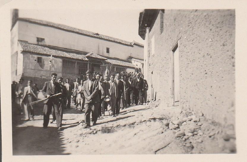 Estoy recogiendo información sobre las procesiones que salían en Ardón y espero poder trasladarla en algún momento, pero como no es fácil conseguirla y posteriormente contrastarla, hoy me limitaré a decirte que, la fotografía, representa la salida de la iglesia de la "procesión del Corazón de Jesús" (ampliándola pueden apreciarse perfectamente el estandarte y la imagen correspondientes); esta fiesta se celebraba el viernes siguiente al segundo domingo después de "Pascua de Pentecostés",... La foto fue obtenida con una vieja camara Boy creo que a principios de los años 50. Nosotros solo acudiamos a Ardon en el Corpus, Semana Santa y verano. Por tanto por ahi se la podria ubicar.