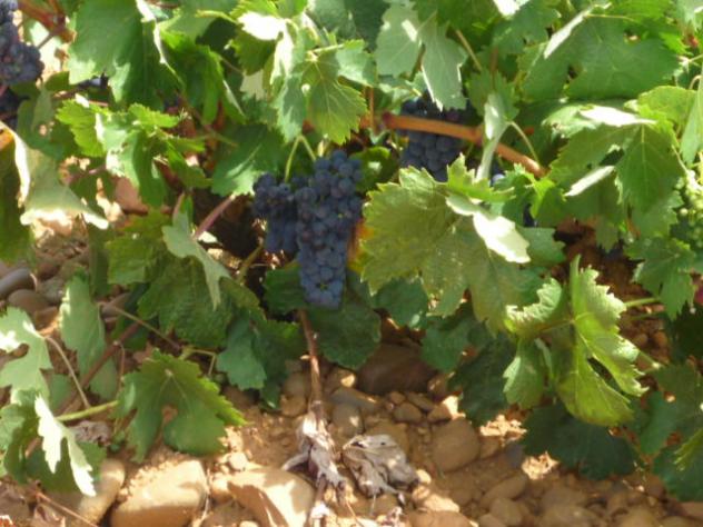 Como veis, el racimo está a menos de un palmo del suelo y con sus uvas completamente negras ya; me di la satisfacción de comerlas y, al hacerlo, comprobé que no tenían acidez ninguna, estaban francamente sazonadas, maduras. Al lado de esta viña, de cepas bajas y ramas rastreras, hay otra de cepas altas y sus racimos colgaban de las ramas a más de tres palmos del suelo; en este caso los racimos tenían sus uvas agraces, verdes todavía la mayoría de ellas, algunas algo pintonas, y todas más pequeñas que las del racimo de la