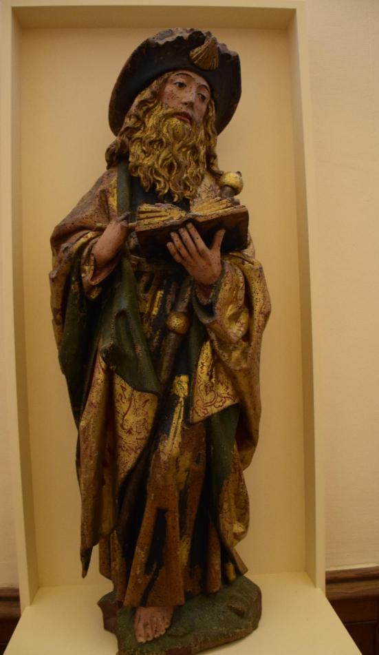 La presente figura de Santiago Peregrino, de autor desconocido, está realizada en madera policromada, en el primer cuarto del siglo XVI. Procede de Turcia, provincia de