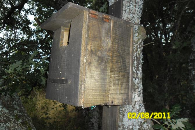 prefabricado de madera por el ecologista Guillermin, para la reproduccion de crias de mochuelo y autillo.