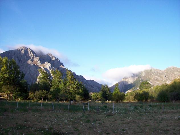 Dehesa y nubes sobre gigantes rocosas,