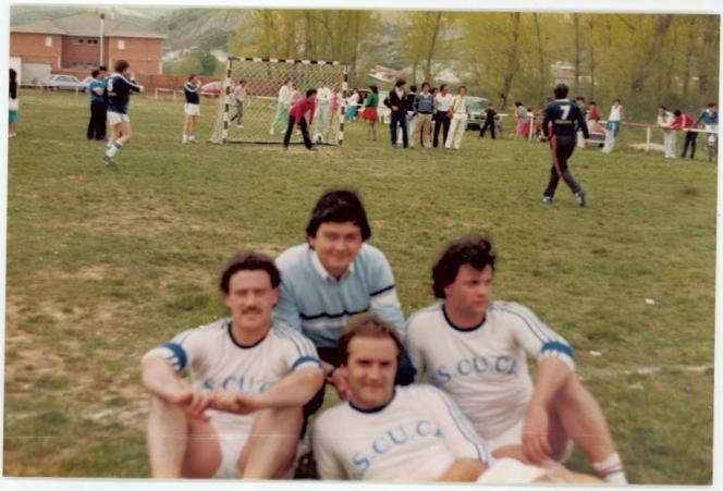 (El que no se consuela es porque no quiere.) El socio nos bombardea agradablemente con más y más fotos. Que tiempos aquellos y que mata de pelo lucía yo, leñe. Luego los años me fueron diciendo que mi insigne abuelo Angelín era el que me había dado sus genes y por eso cuando bailo jotas, para disimular, me pongo el sombrero. Julianín, Toñín el Barbero, un servidor y el incondicional Juan Morla. Viva Canales ¡