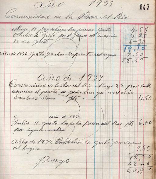 Por aquí tiene Angelín Rosales unas anotaciones de los años 36-37-38, relativas a la cantina, siendo los señores clientes los de la Comunidad de la Presa del Río. Como se puede comprobar, quedó todo pago.