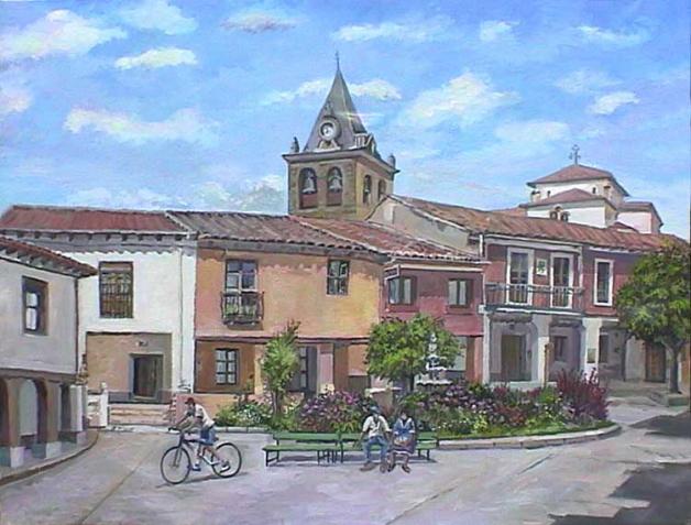 Las plazas son para Alberto Rodrigo como el corazón donde late la vida de los pueblos. Las casas cobran vida y siempre hay un detalle sicológico que él dispone sobreponiéndose a un entorno rural placentero. Es el campanario de la iglesia que se asoma en esta plaza. vigilante y protector. Admirable cuadro.