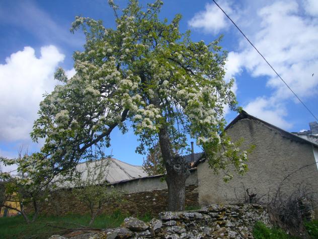 ¡Qué ilusión! El único peral sobreviviente del "fuego bacteriano" de la huerta de los Beltrán, calle abajo ¡FLORECE! Es conocido como el de las peras de Conegunda, aludiendo a la procedencia de un injerto, hecho por Benjamina. Como bien decía Peña, hace días, la fruta de esa huerta era, es, sabrosísima. En un trozo de pared se conservan las piedras albardas y eso hace que la pared se mantenga perfectamente.