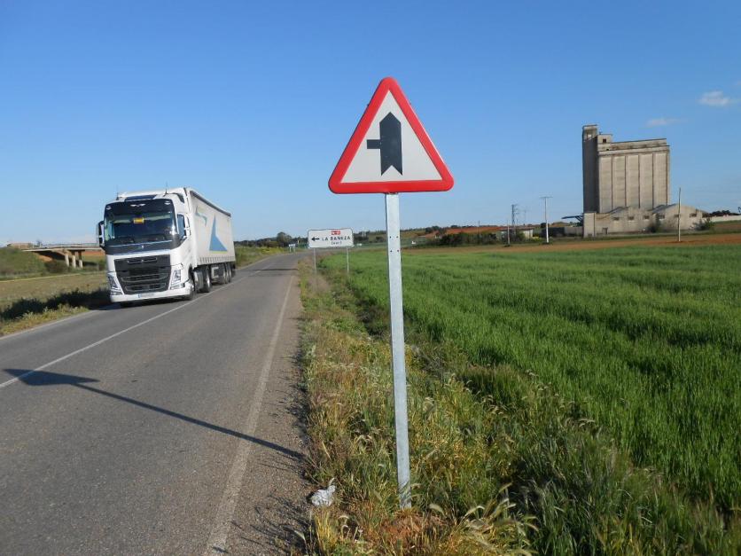 a la izquierda, cuyos usuarios deben ceder el paso. En la derecha de la imagen se puede apreciar un antiguo silo de cereales.