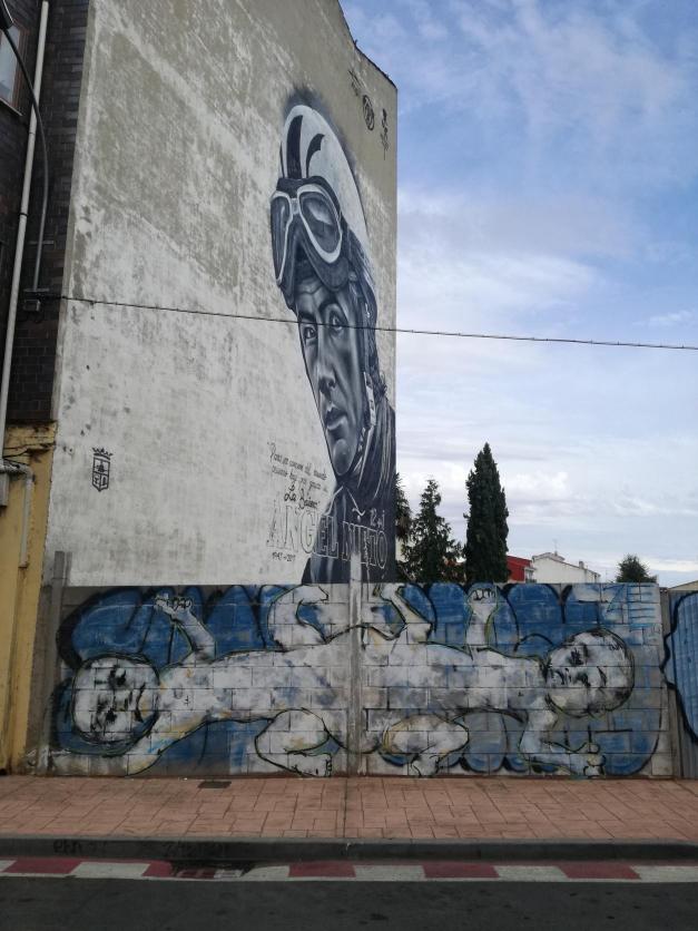 Elena, al fondo de gran tamaño se puede ver el grafiti de Angel Nieto.