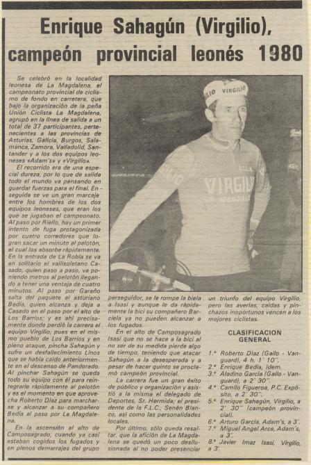 Hubo una época en que el ciclismo fué muy popular en La Magdalena, pero todo pasa en la vida, y esa época, pasó. Ahora no hay nada,... ya ni casi gente, en el invierno se quedan los pueblos vacios, es una pena, pero así es. Tambien hubo afición al moto cros, habia dos corredores en el pueblo El Vico y Chus Jesús, se organizaban corridas en moto por el monte, se iba a las que habia en Valencia de Don Juan, en Astorga, en Benavides, en La Bañeza,....