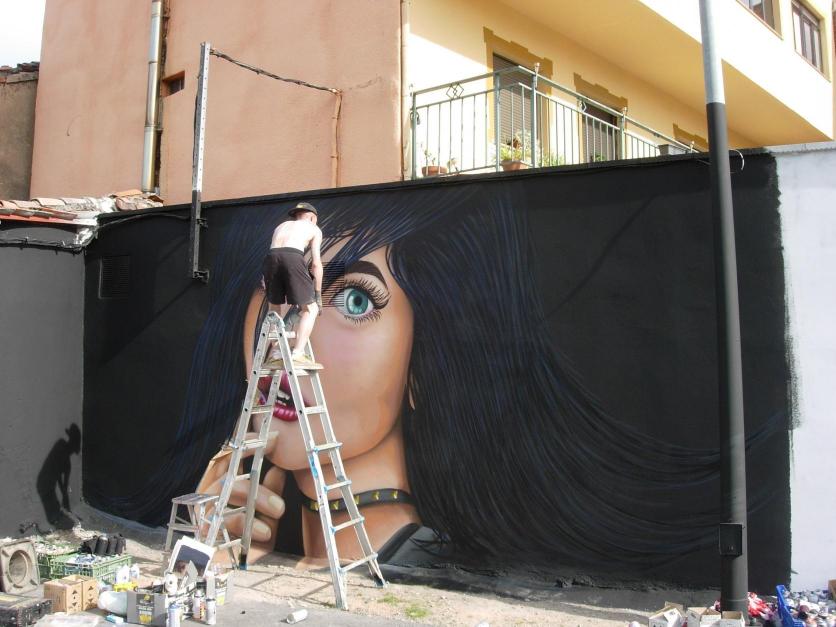Grafitero subido en escalera,
