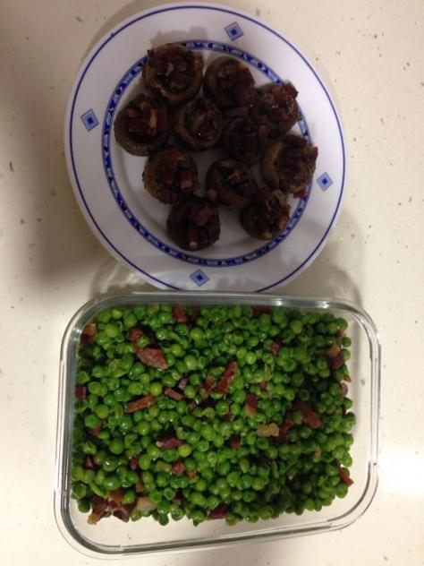 Champiñón relleno, guisantes con jamón,