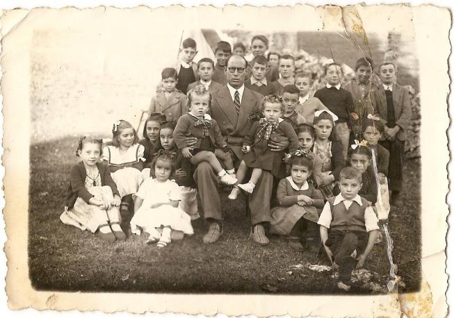 Las que estan sentadas encima del maestro, que son mellizas.