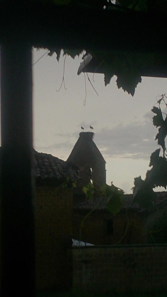Nido de Cigüeñas al anochecer en la espadaña de la Iglesia,