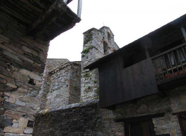 Iglesia entre casas de montaña,