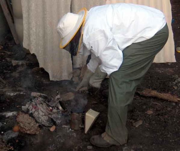 El ahumador consiste de un depósito cilíndrico para el combustible con una reja para contener el material ardiente, una extremidad para dirigir el humo, y un fuelle. El depósito debe cargar suficiente leña para no tener que ser llenado frecuentemente durante las operaciones. EL PROPóLEO.-