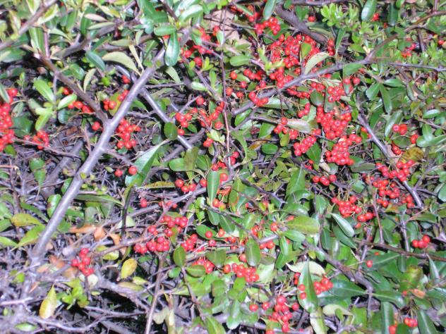 Saludos. Aquí tenemos una Pyracantha, también conocida como Espino de Fuego. tiene unos pinchos que te atraviesan la suela de los zapatos.