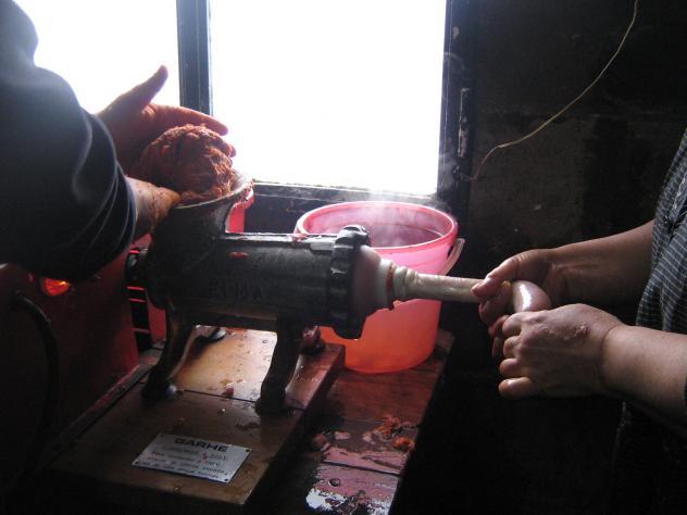 Embutiendo los chorizos,