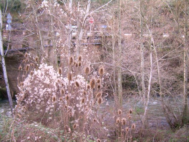 flores de otoño, rio y puente,